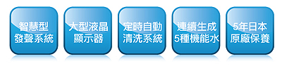 』,主要強化水的能量,供人飲用的鹼性水。帶『-』電荷的物質匯集陽電極之一邊,成為『酸性離子氧化水』,酸水用作消毒之用。